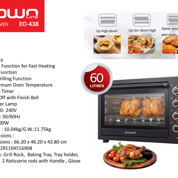 • Experience fast, efficient, and versatile cooking with the Crownline EO-438 Electric Oven. Designed with a spacious 60L capacity, this oven is perfect for baking, grilling, roasting, and everyday cooking needs.
